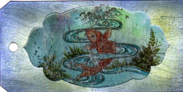 These are my two, after several failed attempts, using an old koi carp stamp from Elusive Images and a fragments stamp from Chocolate Baroque on the actual tag. I discovered that clear embossing powder will actually go opaque if you you reheat and refreeze it enough times! - the backgrounds to the fish are using brusho inks, which are my current addiction.